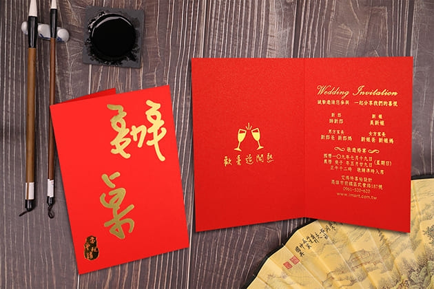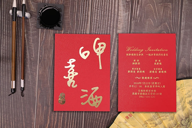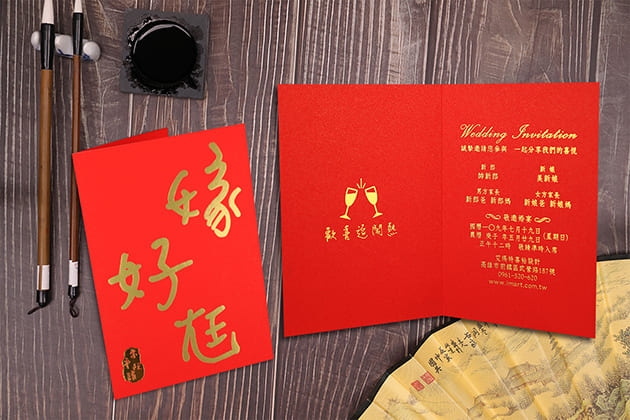 我們的婚期很趕,對喜帖又毫無頭緒,於是上網搜尋喜帖樣式,看到了「艾瑪特喜帖設計」公司,第一次進入網頁就被「甲喜酒」「嫁好尪」「娶好某」等幽默的喜帖標題樣式吸引到,覺得詼諧又可愛,而且大紅色底加燙金的字體,大方又好看!