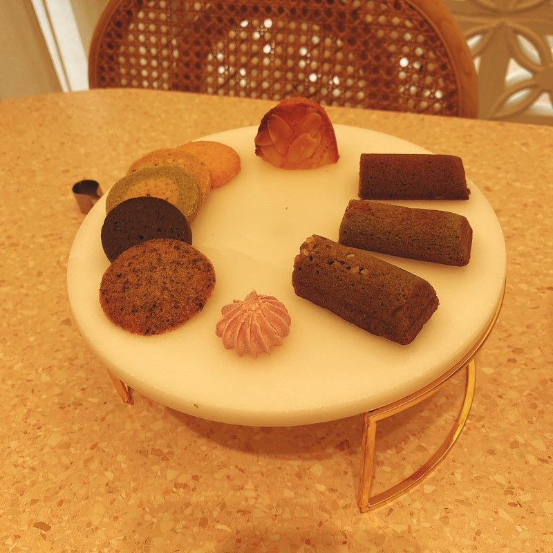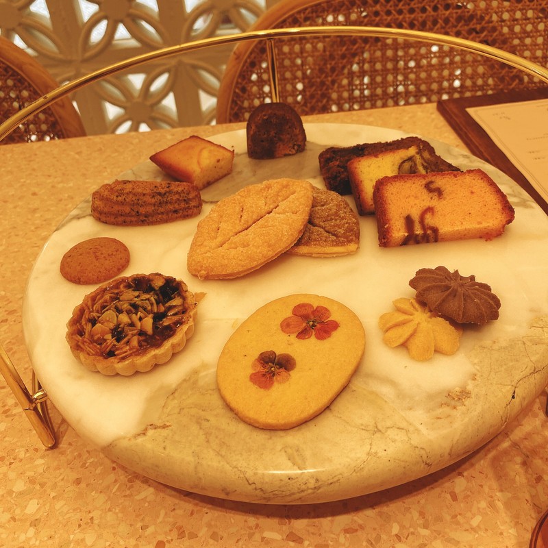 坐下後沒多久,服務我的小姊姊拿出了用大理石裝盤的各式喜餅。搭配著紅茶真的是像級了英式下午茶(真想說來顆司康)。開始的時候她會給口味小卡,可以馬上在喜歡的口味上的表上記號。我採取三角形、圓形、打勾方式區別我的喜愛。
