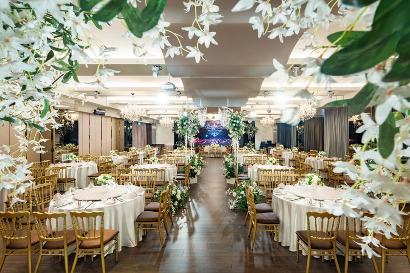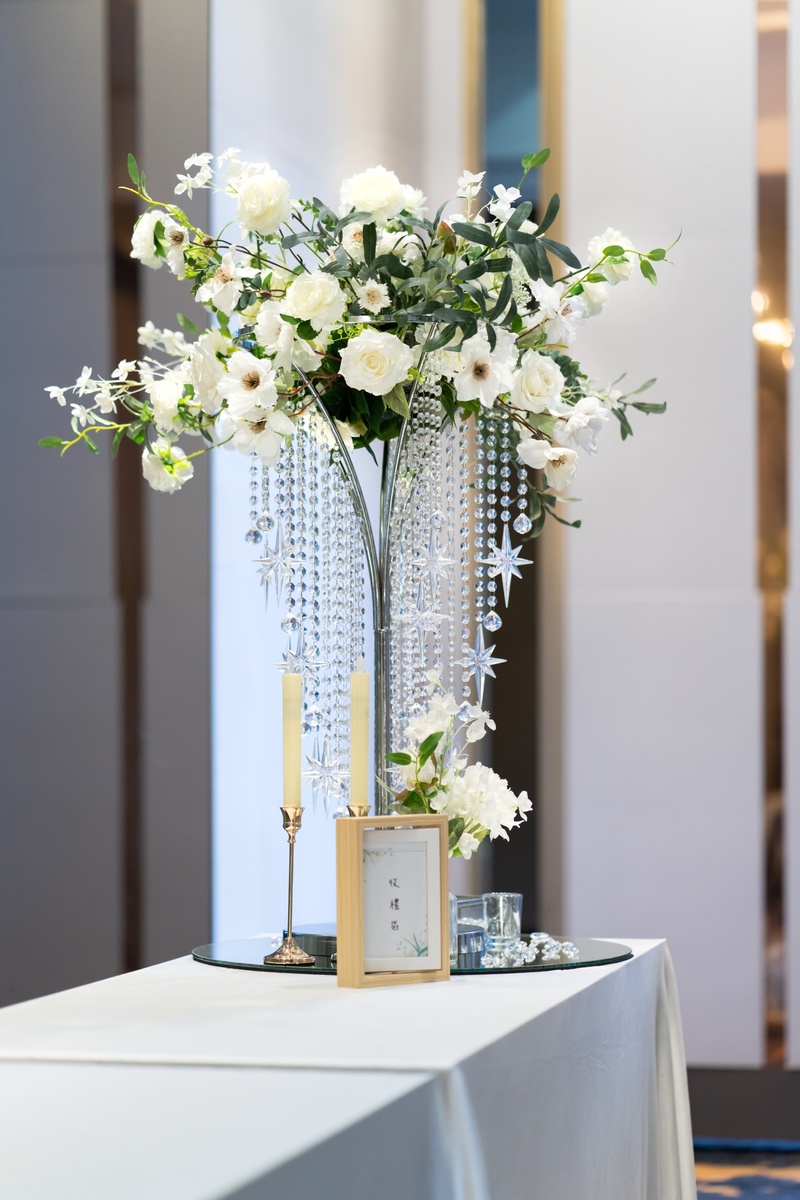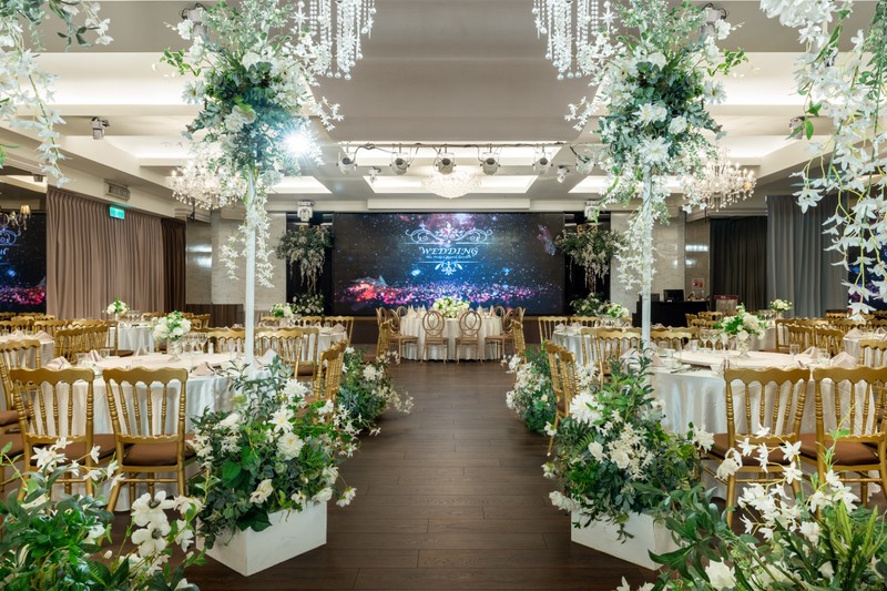 我們選擇的是國際宴會A廳,有兩組拱門且色調白皙透亮,整個廳房內沒有柱子不會有客人被柱子擋到無法看到舞台只能看投影布幕的情況發生,另整體空間上非常足夠又在一樓,對於宴客稍較之下方便。