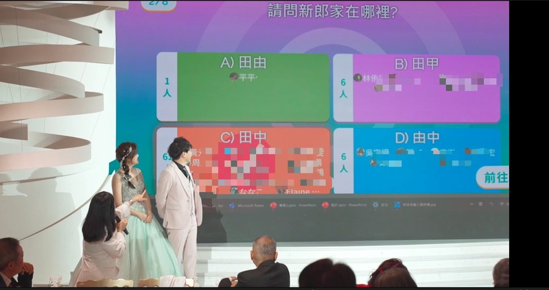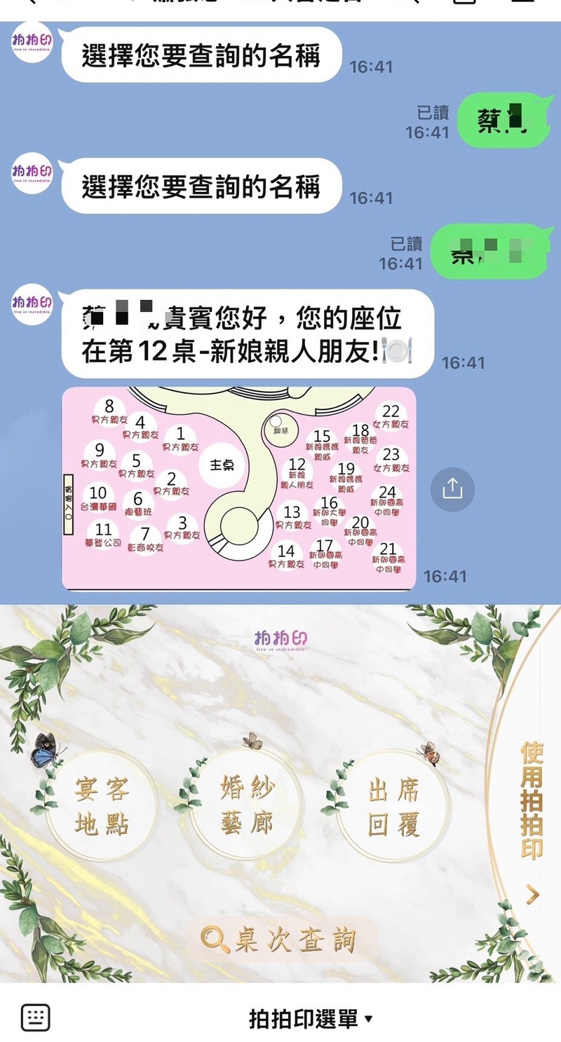 拍拍印有很多不同方案及價格可供選擇,原本有朋友推薦跟團,也有到婚展去看,後來是到一場小型的拍拍印見面會跟業務洽談後下訂了,實際與廠商互動過程很棒,會mail完整的合約及方案、注意事項給新人,Line官方頻道可以編輯及推播給賓客,還能查詢宴客地址及賓客座位(尤其是模糊比對功能真的很棒,可自動回應相似的賓客姓名供挑選),拍拍印列印邊框依照個人化設計,婚紗藝廊的設計讓婚禮輪播更加輕鬆,婚禮中互動遊戲大家參與很熱烈,雖然長輩很多但因為只要掃QR code就可以玩遊戲,所以大家都很容易上手,有將近快一半的賓客都有參與到,沒有參與到的也會被快問快答題目逗得哈哈笑,現場拍拍印櫃位有幫新人影印婚紗照來布置、還有讓賓客寫祝福的話,28桌用兩台機器的方案四小時印好印滿真的辛苦工作人員了,還要協助賓客拍照及教學,還有側拍(拍得很美~又有美肌XD),列印畫質又很讚,婚禮結束時把照片都蒐集起來還用美美的框給我們,真的大推!