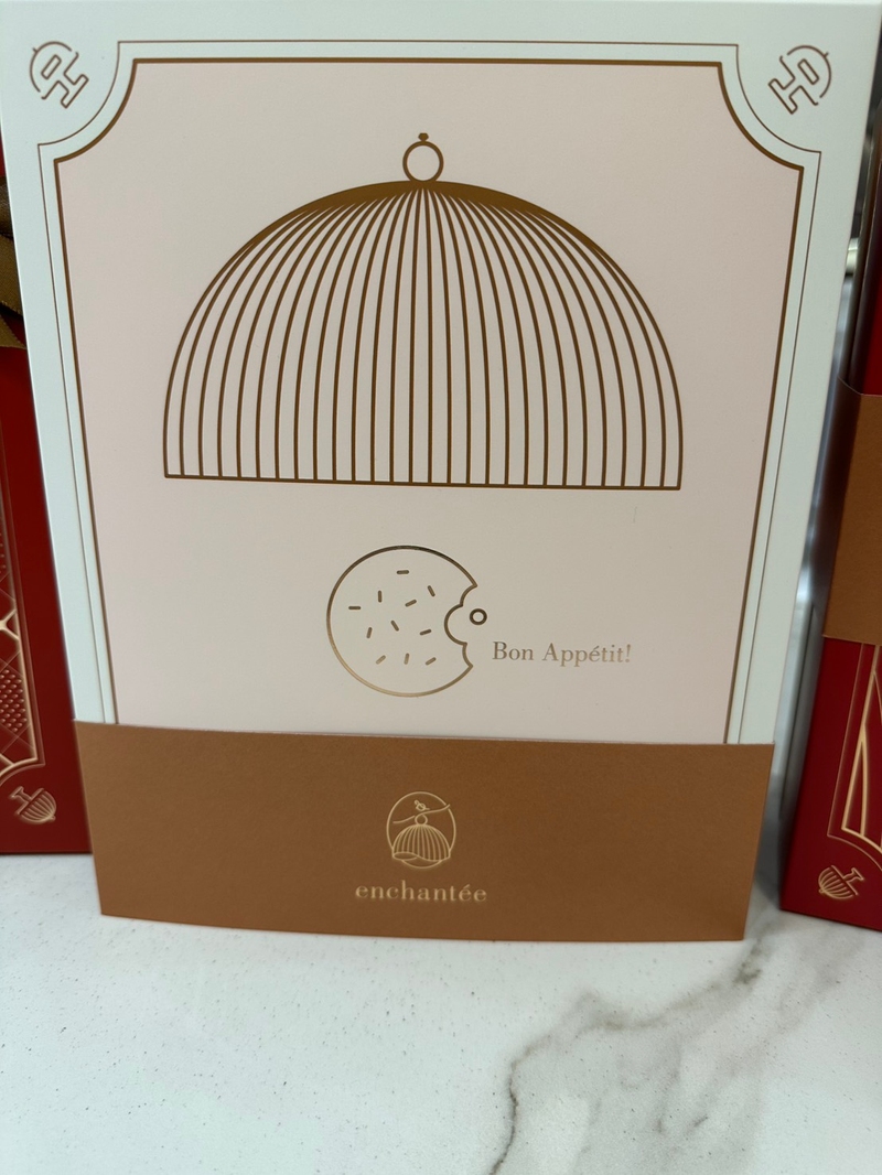 法式餅乾盅則是配上腰封,當你把他推開後會看到開動吧的法文&咬了一口的餅乾,顯得俏皮可愛,粉紅色底色很活潑,完全可以滿足女生的少女心,這款是雙層16片入,上層還有很可愛的小把手提醒大家下面還有一層在等待享用,份量足夠也很適合拿來跟公司同事分享喜悅。