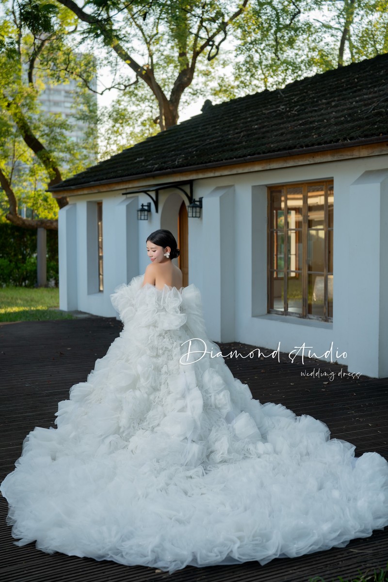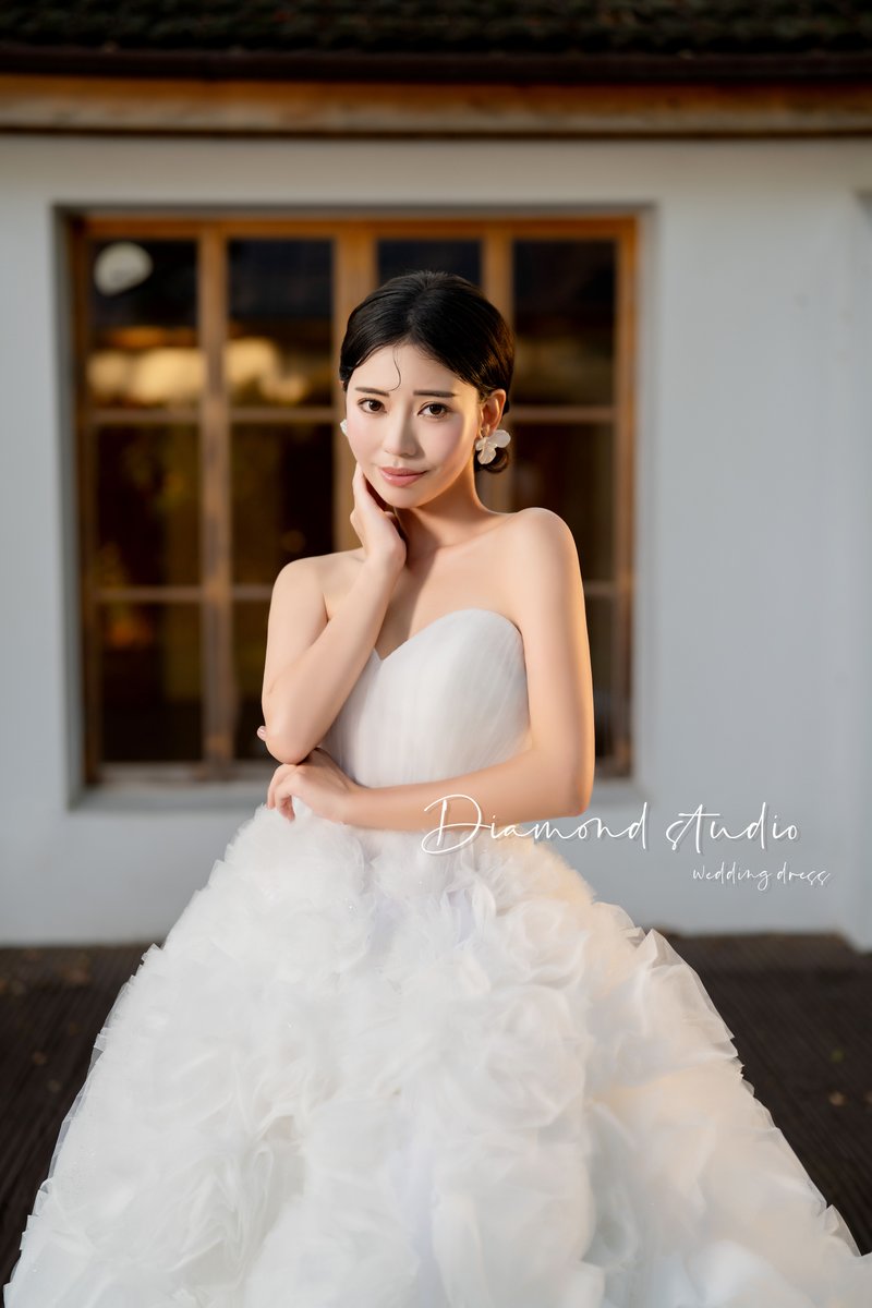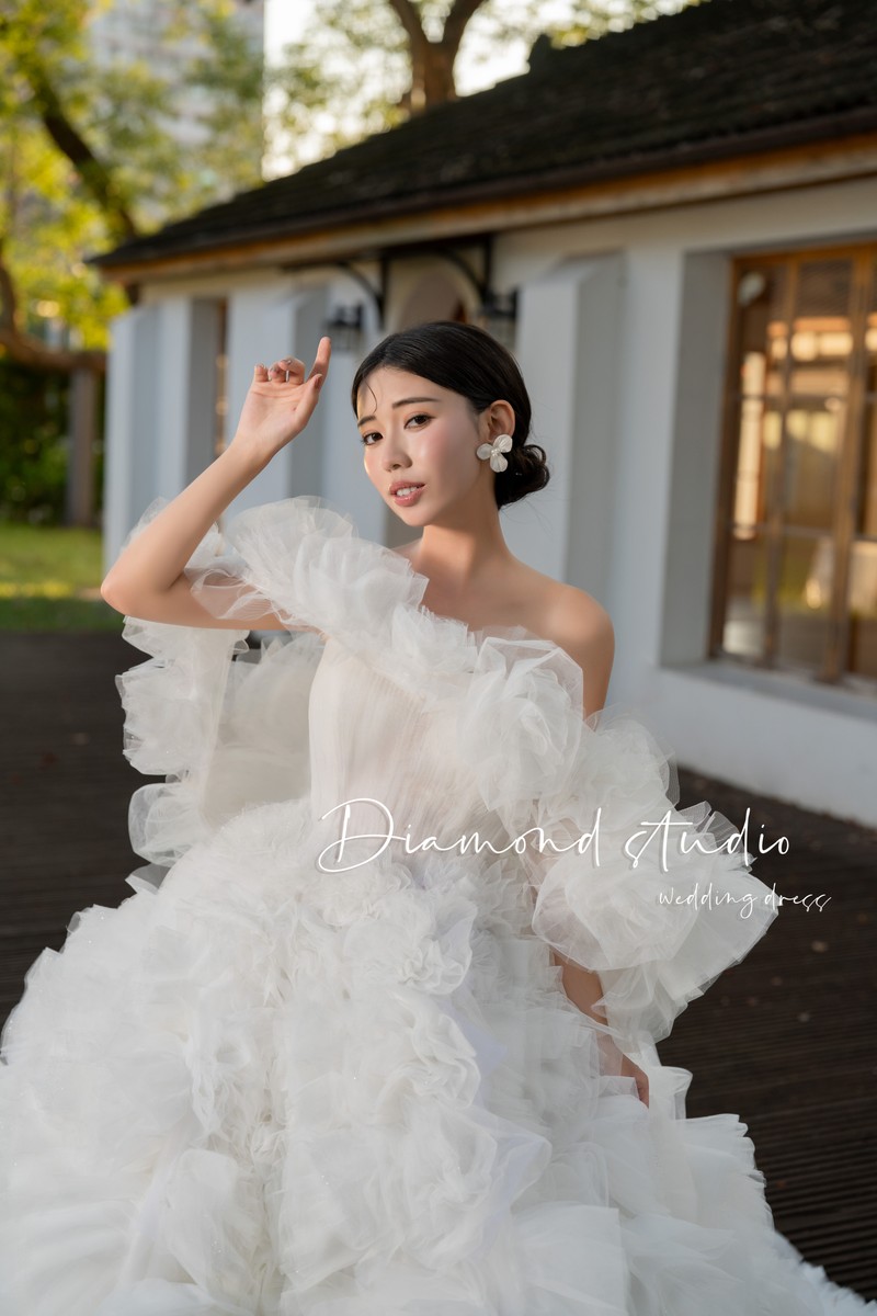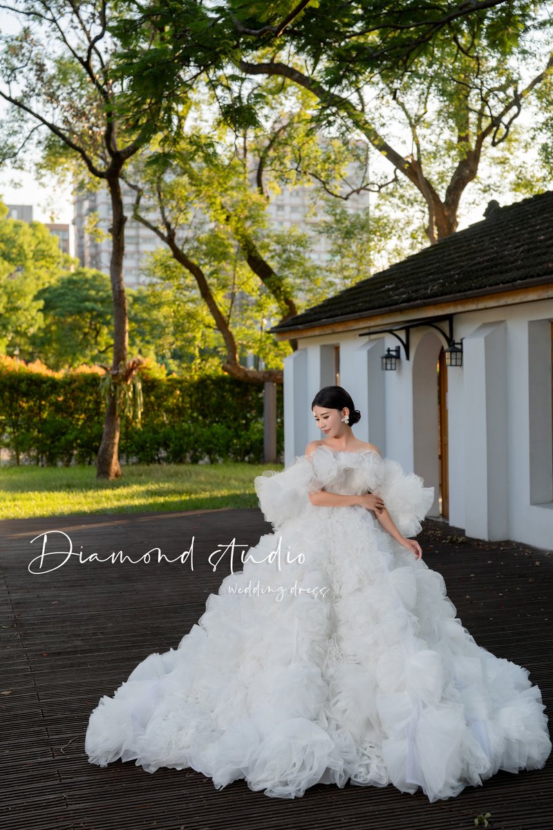 💗【夢幻花宴・立體花朵蛋糕裙】 宛如盛開花園般的浪漫氛圍,層層堆疊的蛋糕裙結構結合立體花朵細節,打造如夢似幻的華麗視覺。澎湃裙襬在柔光下輕盈律動,讓新娘如花朵女神般優雅登場。 【設計亮點】 ・蛋糕裙結構搭配立體花朵裝飾,營造豐富層次與夢幻氣勢 ・卡肩剪裁展現柔美頸肩線條,優雅迷人 ・卡肩設計可拆卸,自由變換造型,兼具甜美與俐落風格 ・整體造型充滿仙氣,澎湃裙襬極具氣勢,特別適合戶外拍攝